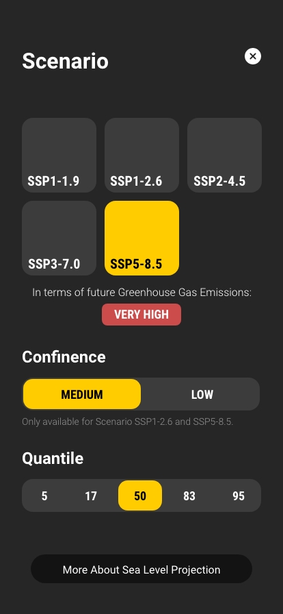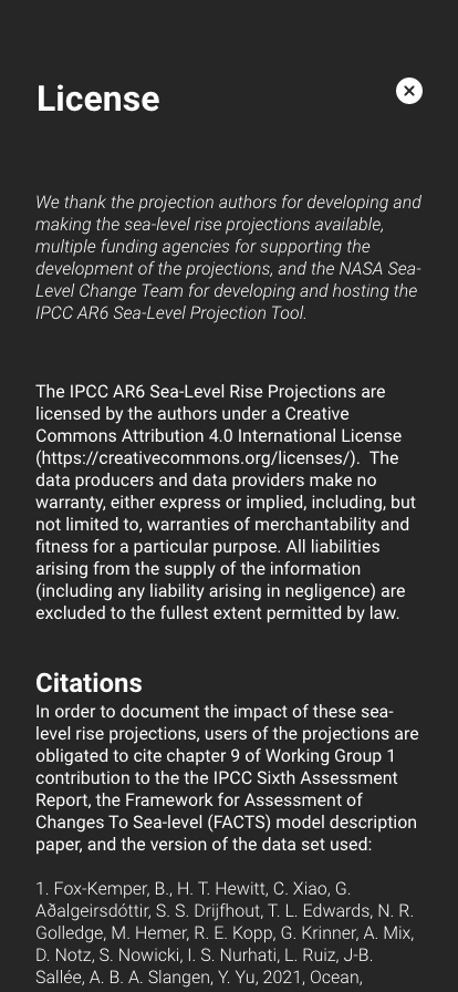 All data and visualization are based on NASA's Sea Level Projecion Tool at https://sealevel.nasa.gov/ipcc-ar6-sea-level-projection-tool.